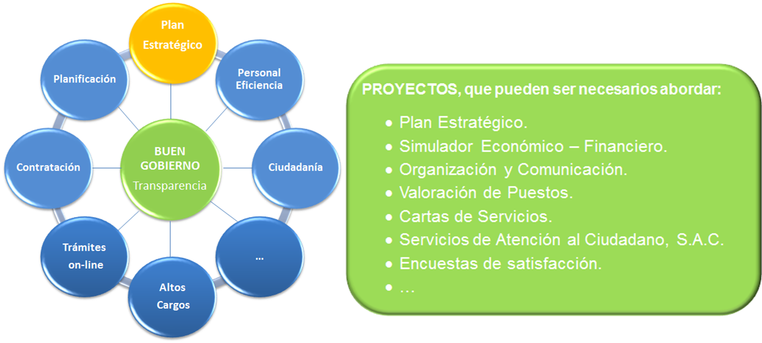 El Buen Gobierno en las Administraciones Públicas (Ley 19/2013) enfatiza la Transparencia, concretándolo en los artículos 6, 7 y 8, relativos a la información institucional, jurídica y económica. La Transparencia se convierte así en uno de los pilares de la Gestión Pública, que puede ser desarrollada incluyéndola en el Plan Estratégico, que proponga Objetivos, Acciones a llevar a cabo, su Control y la Evaluación del grado de Ejecución y Transparencia alcanzados.Algunos aspectos, sobre los que trabajar, con el criterio de Transparencia, en el ámbito del Buen Gobierno, son los siguientes: