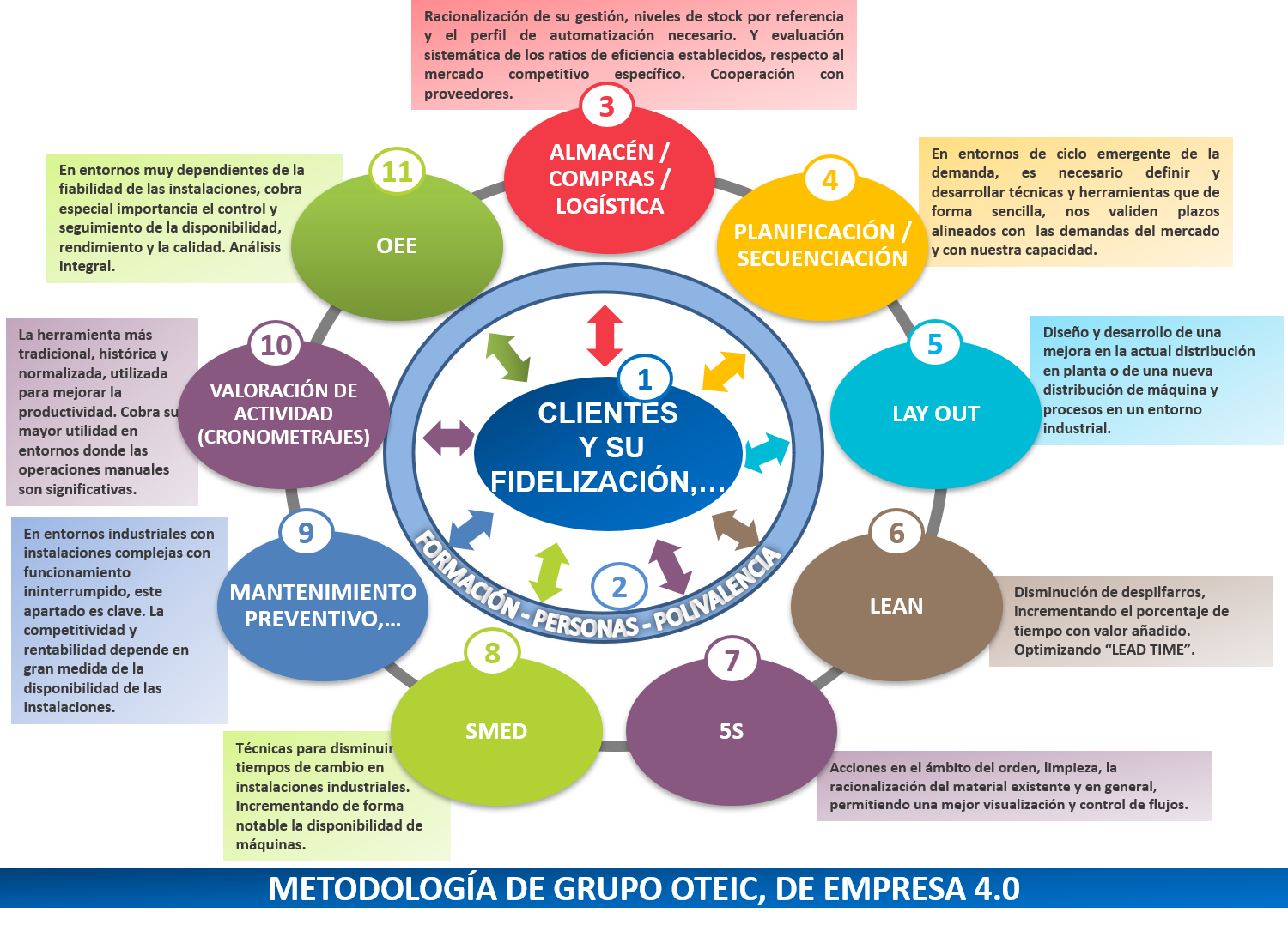 El Equipo de Asesoramiento de Oteic, pone a su disposición la amplia experiencia de más de 50 años en el Sector Industrial y, su experiencia específica en la Adaptación a Entornos eficientes 4.0 y, en la mejora de generación de valor de su Organización, mediante el siguiente Plan de Integración de los 11 "Fundamentales" de la Metodología de Gestión Industrial 4.0, de Grupo Oteic: