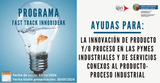 Le informamos sobre el Programa de Ayudas Fast Track Innobideak de la SPRI, para ayudar a las empresas industriales vascas, o ligadas a la industria, en sus proyectos de innovación en materia de procesos, productos, servicios, o de incorporación de modelos y herramientas que permitan a las empresas progresar hacia un modelo de Gestión Avanzada.